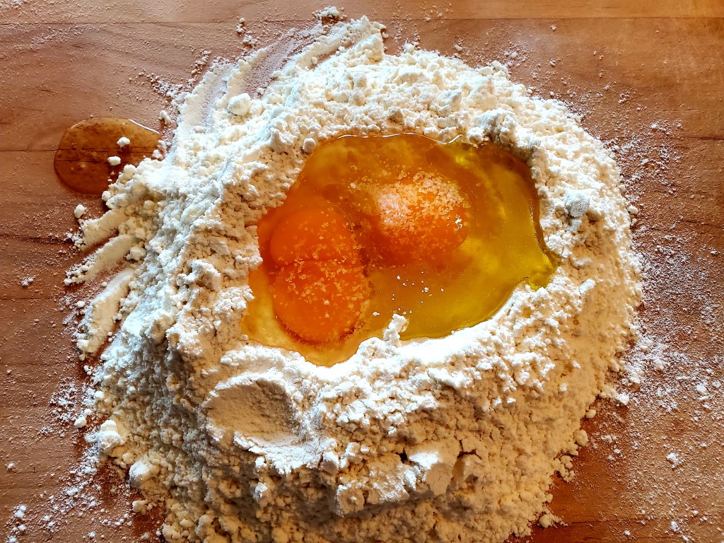 Directions: Use a whisk, a sifter or a screened colander to sift flour onto your work surface. Sprinkle salt on flour. Make a well in the center of flour and add eggs and the oil. Using your fingers mix the egg into the flour until the dough is created. If it seems to dry add just a touch of water. Cover and let rest for 15 minutes. It’s now ready for your favorite pasta recipe. Enjoy, and Let’s Get Cooking!