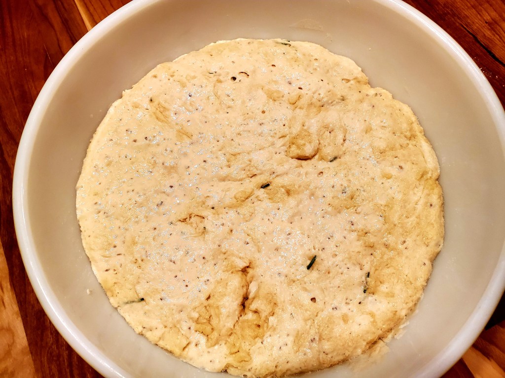 You will start the night before. in a bowl, whisk together flour, salt and any herbs you are using. Set aside. In a large bowl place luke warm water, (Not HOT) yeast and sugar. Wait till the yeast starts to bubble and get frothy. Once yeast is ready, add oil and stir. Add flour mixture to yeast liquid and mix until well combined. (no need to Kneed ;)) *NOTE If you are adding wet ingredients, dust them with flour first and add them on top of flour before mixing. After mixed scrape down the sides into a lump like pictured above. Cover with plastic wrap and leave out on counter overnight. It can stay in bowl covered up to 18 hours.